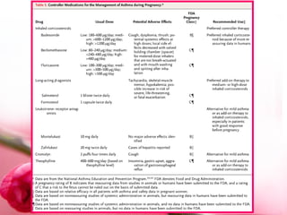 El documento discute el asma como una de las condiciones médicas más comunes que complican el embarazo, afectando al 4-8% de las mujeres embarazadas. El asma incontrolada puede causar hipoxia materna e hipoxia fetal, lo que puede afectar el crecimiento y supervivencia del feto. El tratamiento del asma durante el embarazo incluye la educación a la paciente, el control de factores desencadenantes, y la terapia farmacológica con corticosteroides inhalados y agonistas beta-2