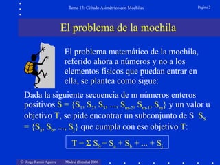Este documento describe el cifrado asimétrico basado en el problema matemático de la mochila. Explica cómo Merkle y Hellman propusieron en 1978 un sistema de cifrado de clave pública que utiliza una "mochila con trampa", creando una mochila difícil a partir de una mochila simple de forma que el cifrado se realiza con la mochila difícil y el descifrado con la mochila simple. La trampa actúa como la clave privada, mientras que la mochila difícil es la clave pública. Luego procede a ilustrar un
