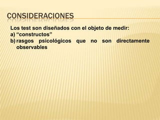 El documento describe los pasos para construir un test psicológico válido y fiable. Primero, se debe definir claramente el rasgo a medir y su relación con la conducta observable. Luego, se planifica el test considerando factores como la población a la que va dirigido y su formato de aplicación. Después, se elaboran ítems potenciales y se seleccionan los mejores basados en criterios estadísticos. Más adelante, se estudia la fiabilidad y validez del test a través de métodos estadísticos