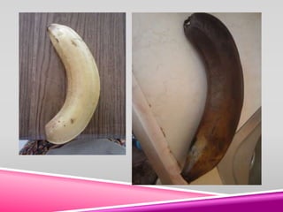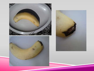 Este documento presenta los resultados de tres observaciones de plátanos realizadas por una semana en diferentes condiciones ambientales. En un ambiente caluroso como un automóvil, el plátano se descompuso rápidamente volviéndose completamente negro y seco en cinco días. En el refrigerador, el plátano se maduró y quemó más rápido que a temperatura ambiente, volviéndose completamente quemado al final de la semana. A temperatura ambiente, el plátano conservó su color y nutrientes aunque ganó pequeñas manchas oscuras en