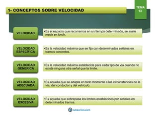 El documento presenta información sobre conceptos y límites de velocidad para diferentes tipos de vehículos y vías. Define conceptos como velocidad, velocidad específica, velocidad genérica y velocidad excesiva. Establece los límites de velocidad máxima y mínima para cuatro grupos de vehículos en autopistas, autovías y carreteras convencionales. También cubre distancias mínimas entre vehículos y casos en los que se debe reducir la velocidad.