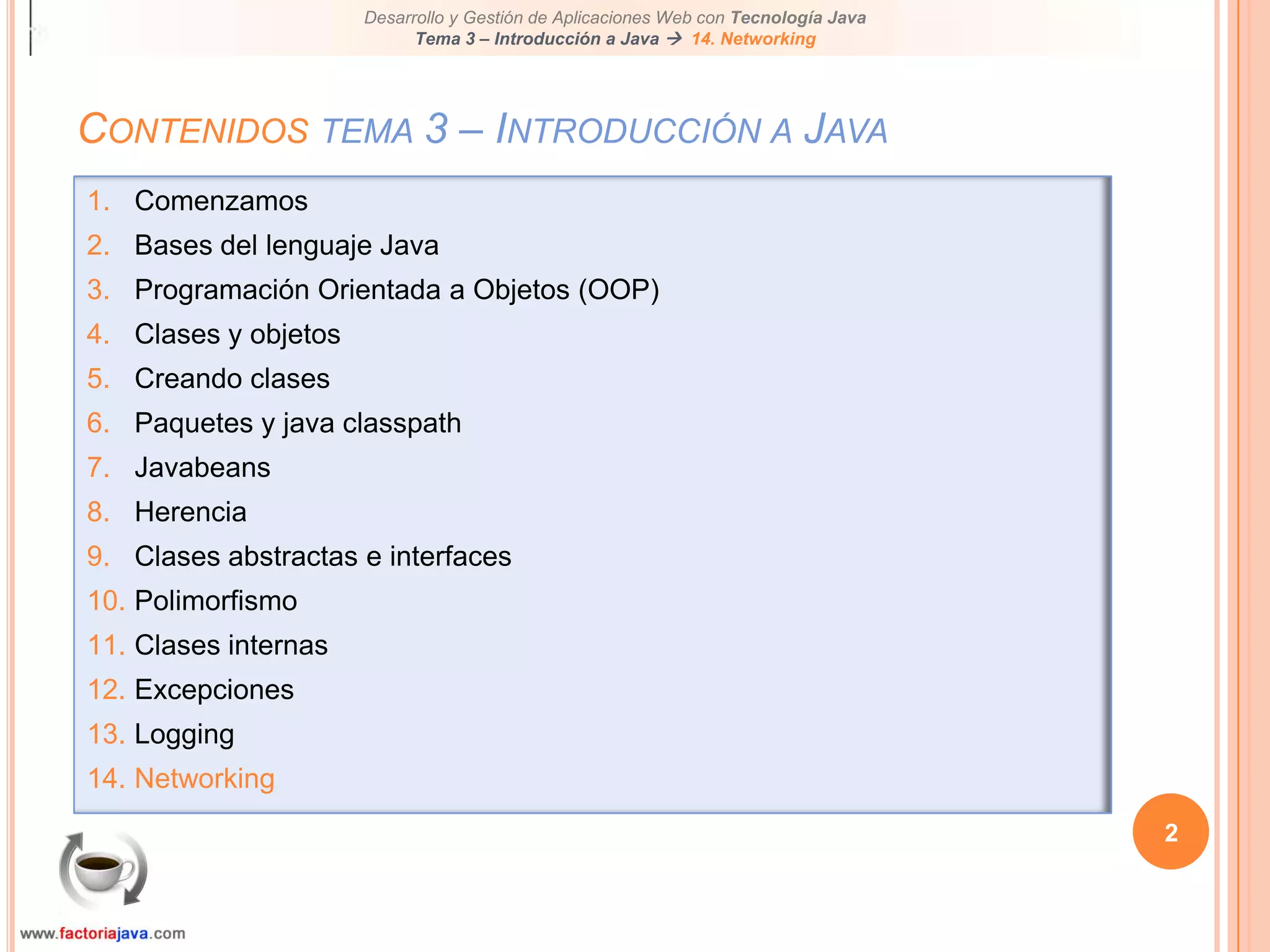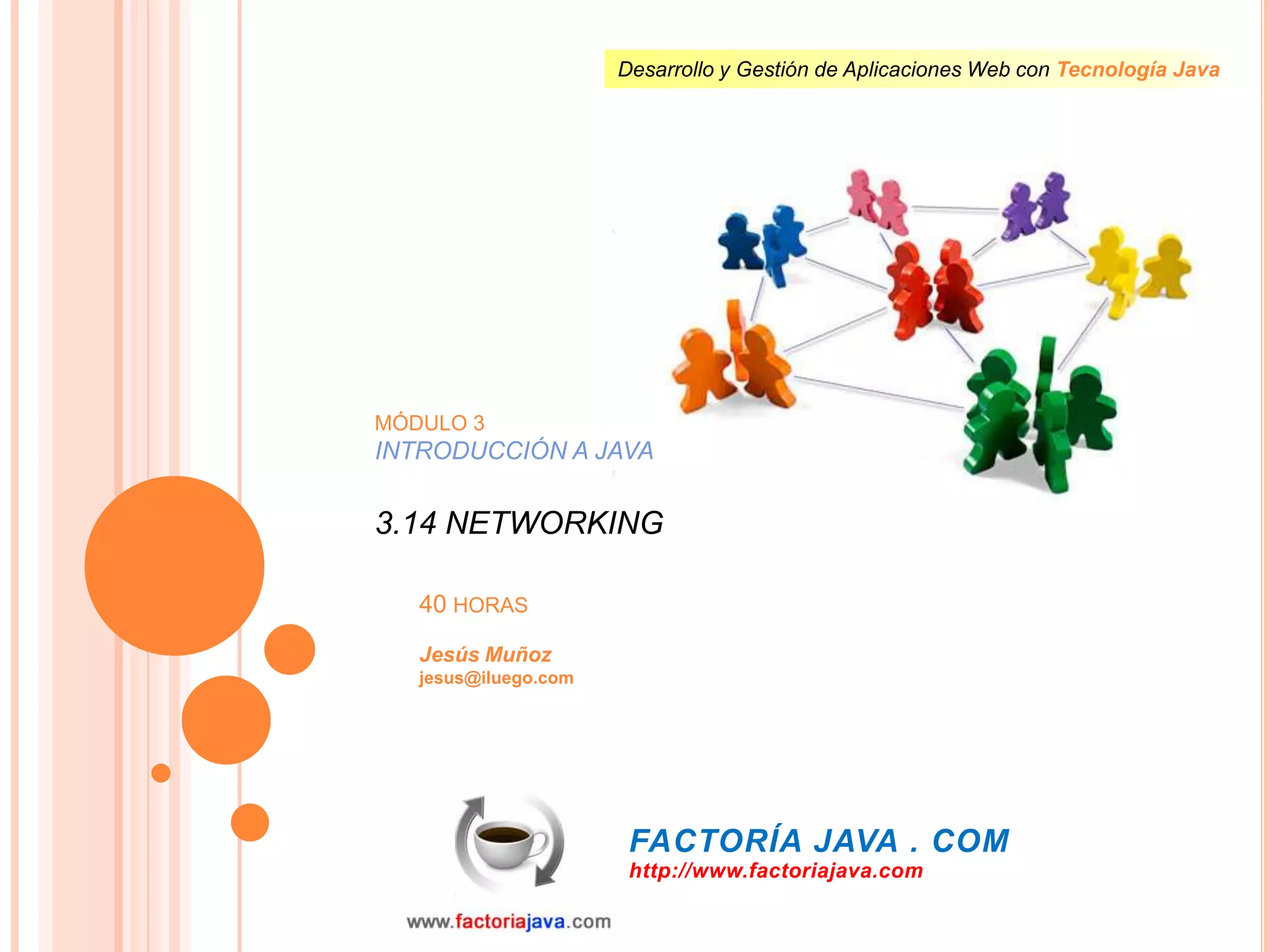 Este documento presenta los conceptos básicos de networking en Java. Explica conceptos como direcciones IP, protocolos, puertos, paradigma cliente/servidor y sockets. Luego describe el paquete de red Java, incluyendo las clases ServerSocket, Socket, MulticastSocket y DatagramPacket que permiten desarrollar aplicaciones de red en Java. Finalmente, resume brevemente los contenidos de Internet y puertos.
