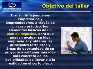 Este documento proporciona una guía de 13 pasos para crear un plan básico de negocios. Explica los principales errores que cometen los emprendedores, los beneficios de tener un plan, y los elementos clave que debe incluir como descripción del negocio, metas financieras, productos, precios, y estrategias de marketing. Además, presenta un caso práctico de una pastelería para demostrar cómo aplicar estos conceptos al evaluar y dirigir un nuevo negocio.