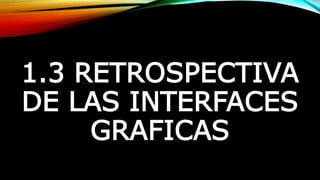 El documento describe la evolución de las interfaces gráficas desde 1990 hasta la actualidad, incluyendo el desarrollo de ventanas, iconos e interfaces en dispositivos como computadoras, tabletas, teléfonos inteligentes y relojes inteligentes. Se destacan hitos como las primeras interfaces gráficas de Windows, el desarrollo de tabletas táctiles por Nokia y Apple, el surgimiento de consolas con controles inalámbricos como la Wii, y el uso extendido de pantallas táctiles y realidad aumentada en dispositivos actuales