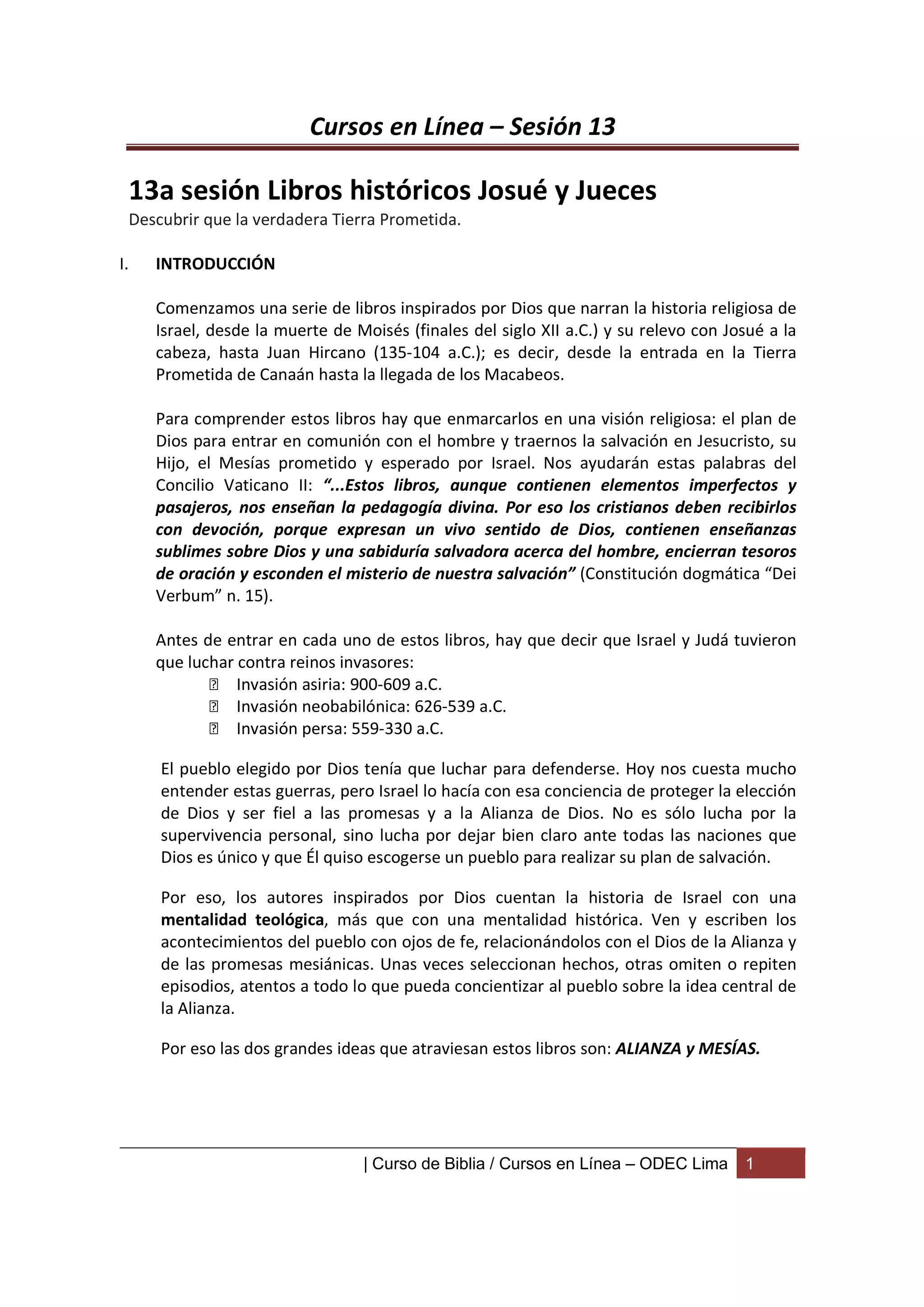 Este documento presenta una sesión sobre los libros de Josué y Jueces. Explica que estos libros narran la historia de Israel desde la muerte de Moisés hasta la llegada de los Macabeos, y su lucha para poseer la Tierra Prometida mientras permanecían fieles a su alianza con Dios. Describe que los jueces eran líderes carismáticos elegidos por Dios para liberar a Israel de sus enemigos cuando pecaban e idolatraban. El objetivo es mostrar que la verdadera tierra prometida