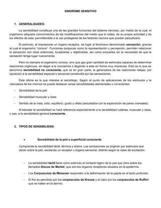 El documento describe los diferentes tipos de sensibilidad del cuerpo humano, incluyendo la sensibilidad de la piel, muscular y ósea. Explica las vías de la sensibilidad y las áreas sensitivas corticales. También describe varios síndromes sensitivos como la disociación siringomielica, tabética y periférica, así como síndromes hemianestésicos.