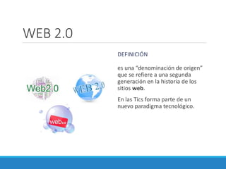 La Web 2.0 es una nueva generación de sitios web que permite una mayor participación de los usuarios. Sus herramientas han cambiado procesos de aprendizaje y hábitos de búsqueda de información, generando nuevas formas de organización social. La Web 2.0 es abierta y democrática, fomentando la autoría y compartición de contenidos entre multitudes inteligentes.