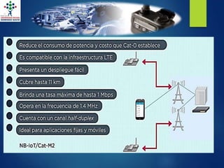 NB-IoT es una nueva tecnología emergente para Internet de las Cosas que ofrece bajo consumo de energía, conectividad estable, bajo costo y una arquitectura optimizada. A medida que NB-IoT madure, se utilizará en más campos e industrias debido a sus ventajas sobre otras tecnologías IoT existentes. El documento fue escrito por el Ing. Melvin Gustavo Balladares Rocha de la Universidad Privada Domingo Savio en 2022.