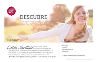 El documento es una invitación a un evento sobre el producto Zrii para perder peso de forma saludable. Incluye información sobre cómo podrías perder hasta 10 libras en 10 días usando Zrii y aprender más sobre el producto. También proporciona detalles sobre la fecha, ubicación y contacto del evento.