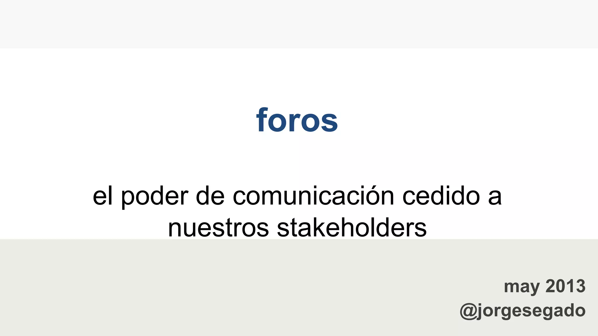 El documento aborda la importancia de los foros como espacios de comunicación entre diferentes stakeholders, enfatizando que las marcas deben facilitar el diálogo y no solo proteger sus intereses. Se discuten desafíos de la nueva comunicación, como la honestidad y la ética, así como la necesidad de adaptarse al entorno digital. Además, se mencionan factores de éxito para una comunidad en foros, incluyendo la generación de reputación y el conocimiento continuo.