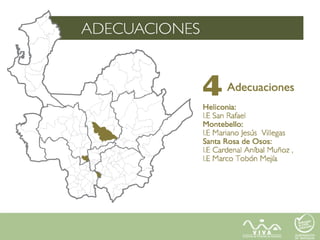 Este documento presenta el plan de ejecución y contratación de la Empresa de Vivienda de Antioquia (VIVA) para los años 2013-2014. El plan incluye la construcción de 34,676 viviendas nuevas y 350 lotes en municipios, a través de diferentes programas como vivienda gratuita, Banco Agrario, Aldeas y para indígenas. Se describen los procesos de contratación de obras y supervisión, y se dividen las regiones del departamento en zonas para agrupar los procesos contractuales.