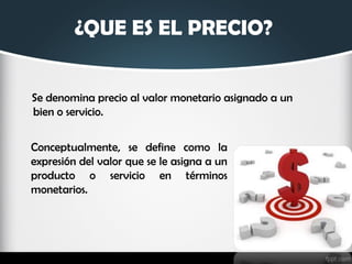 El documento analiza el concepto de precio y las políticas de precios. Define el precio como la expresión monetaria del valor de un producto o servicio. Explica que el análisis de precios debe considerar tanto la perspectiva del cliente, enfocada en el valor y beneficios, como la de la empresa, enfocada en generar ingresos. Además, señala que al establecer precios es importante considerar el tipo de mercado al que va dirigido el producto o servicio.