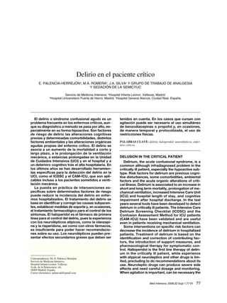 El documento describe el delirio o síndrome confusional agudo en pacientes críticos. Señala que el delirio es un problema común pero infradiagnosticado en la UCI. Identifica factores de riesgo como alteraciones cognitivas previas, comorbilidades, factores ambientales y alteraciones orgánicas agudas. Explica que el delirio se asocia con un aumento de la mortalidad y la estancia hospitalaria. Finalmente, discute herramientas como el CAM-ICU y el ICDSC para la detección del delirio en la UCI, incluso en