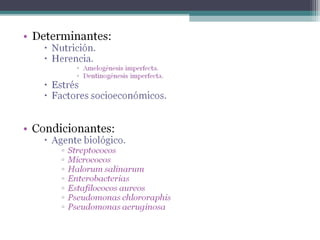 El documento define la caries dental como la destrucción progresiva y localizada de los dientes, causada por un proceso infeccioso mediado por bacterias. Explica diversas clasificaciones de la caries según su morfología, gravedad, cronología y tejidos afectados. También describe factores de riesgo como la dieta, microbiota bucal y teorías sobre sus orígenes como la química, proteolítica y proteólisis-quelación.
