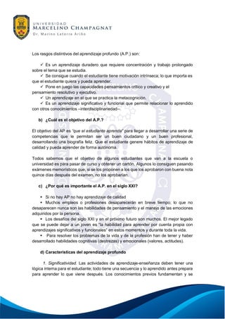 El documento habla sobre el concepto de aprendizaje profundo. Explica que es un aprendizaje significativo y funcional en el que el estudiante está motivado intrínsecamente. Tiene como objetivo que el estudiante desarrolle competencias a largo plazo y pueda aprender de forma autónoma. Describe las características del aprendizaje profundo, como requiere concentración prolongada, pensamiento crítico y creativo, y es interdisciplinario. Finalmente, explica que implica tanto el desarrollo de habilidades cognitivas como em