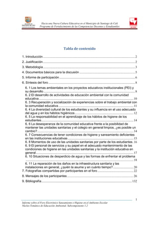 El documento presenta el informe de un foro electrónico sobre saneamiento e higiene en el ambiente escolar realizado entre docentes y estudiantes de 25 instituciones educativas de Santiago de Cali. El foro contó con la participación de 63 personas que aportaron 272 mensajes respondiendo 11 preguntas sobre temas como la inclusión de la educación ambiental en los proyectos educativos, situaciones de desperdicio de agua, coordinación de actividades ambientales con la comunidad educativa, influencia de la cultura en hábitos de higiene y responsabilidad por los