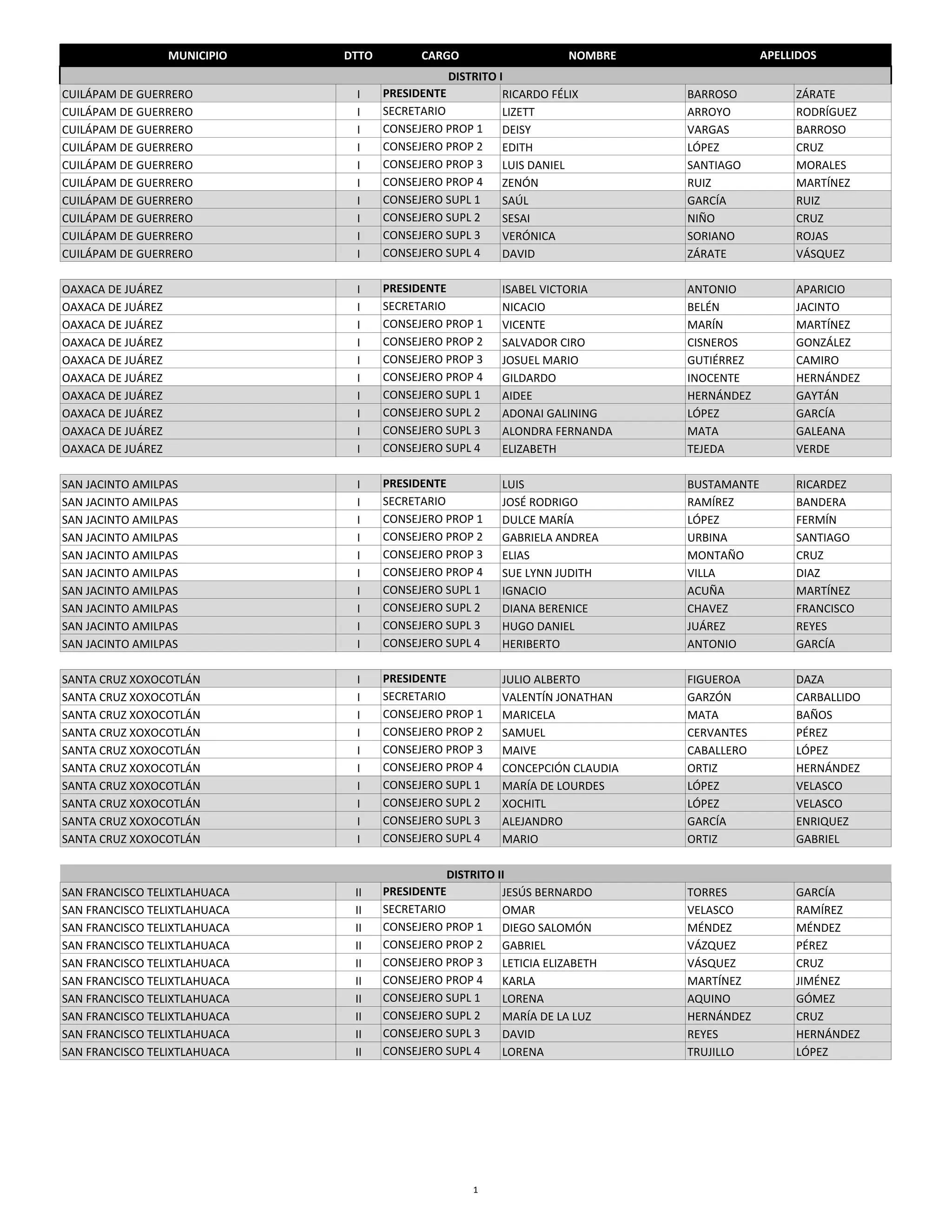 El documento lista los nombres de los presidentes, secretarios, consejeros propietarios y suplentes de varios municipios en Oaxaca, México. Incluye la información de cada persona como su nombre, apellidos, cargo y el municipio y distrito al que pertenecen.