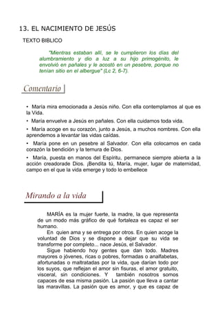El documento describe el nacimiento de Jesús según el Evangelio de Lucas. María dio a luz a su hijo primogénito Jesús y lo envolvió en pañales y lo acostó en un pesebre porque no tenían sitio en el albergue. El documento también reflexiona sobre el papel de María como madre y su entrega a Dios y a los demás.