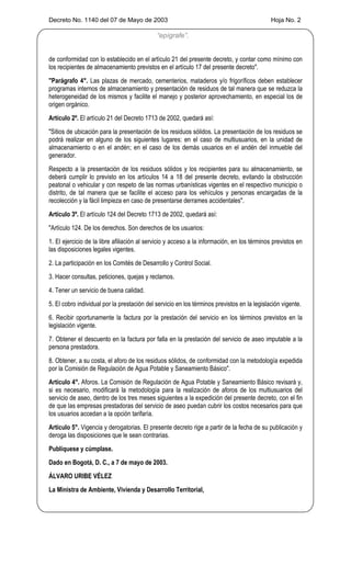 Este decreto modifica parcialmente el Decreto 1713 de 2002 relacionado con las unidades de almacenamiento de residuos sólidos. Establece requisitos mínimos para las unidades de almacenamiento colectivo de residuos en edificios de varios apartamentos. También modifica artículos relacionados con los sitios de presentación de residuos y los derechos de los usuarios del servicio de aseo.