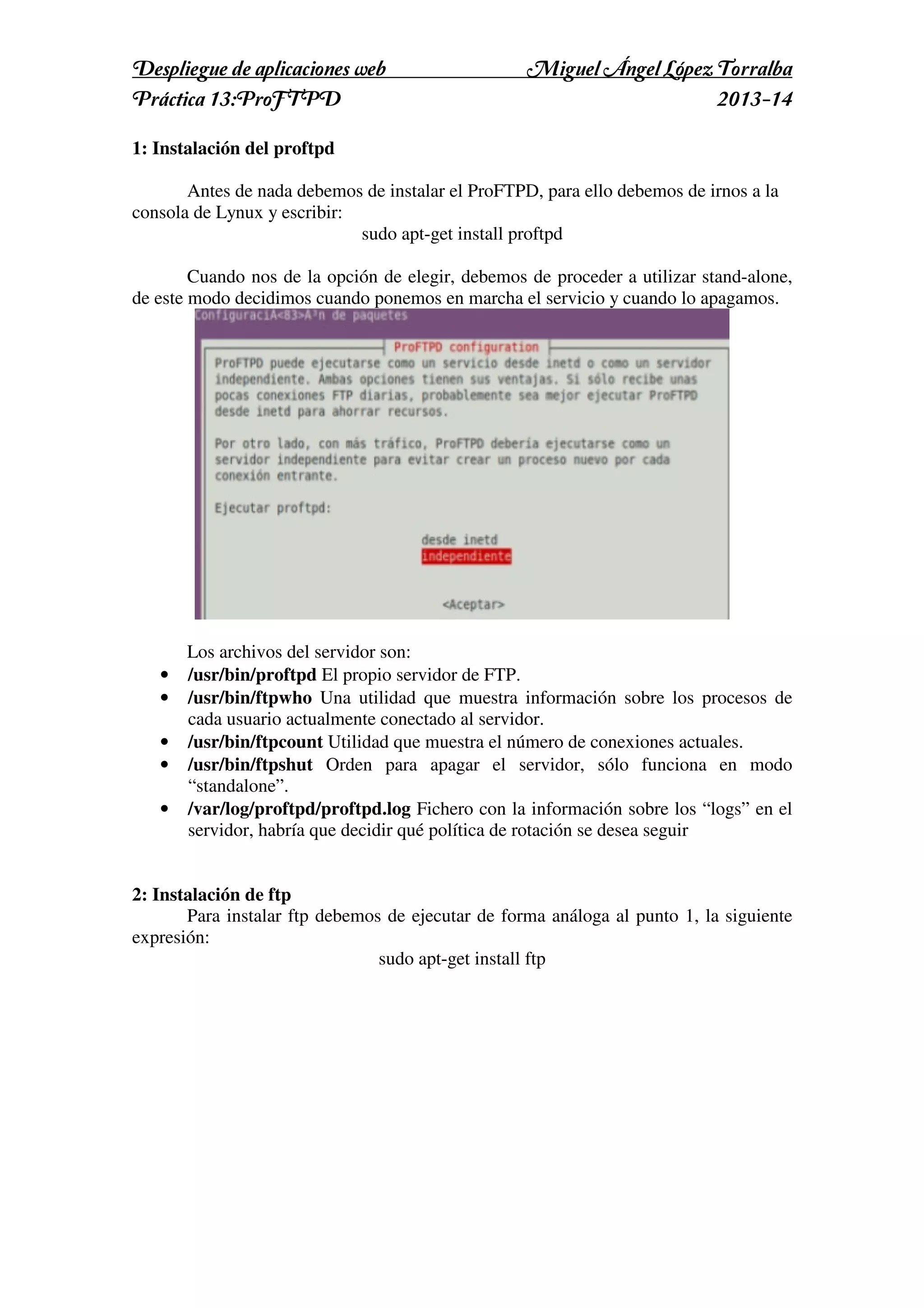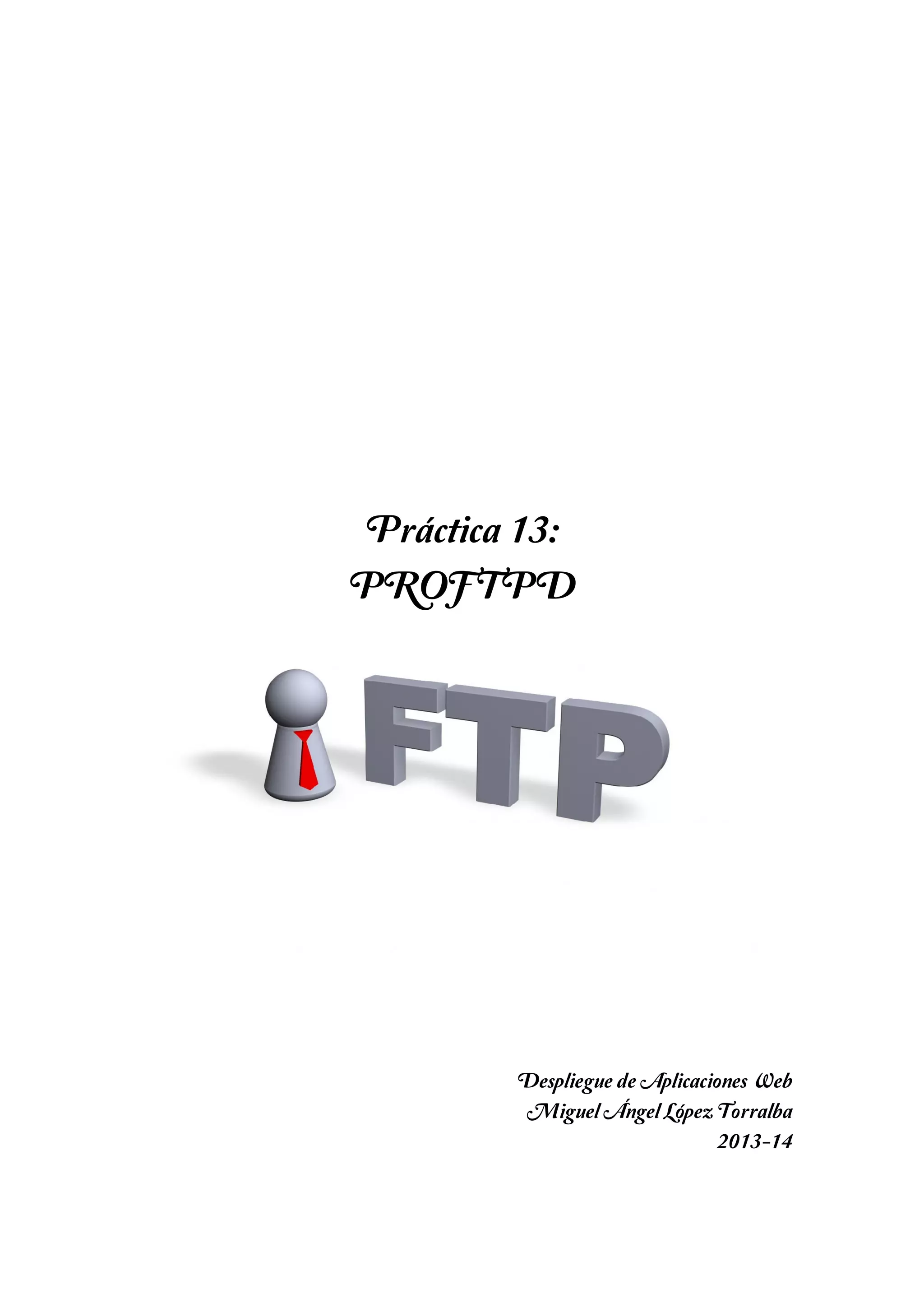 Este documento describe los pasos para configurar un servidor FTP utilizando ProFTPD en Linux. Inicialmente se instala ProFTPD y ftp, luego se configura para permitir y denegar acceso a usuarios específicos, permitir acceso anónimo y de invitados, y restringir el acceso de usuarios a sus propios directorios. Finalmente, se crea una carpeta pública compartida y se copia un archivo desde ella usando el cliente FTP Filezilla.