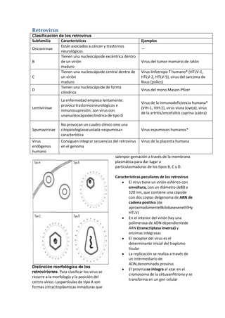 El documento clasifica los retrovirus en cuatro subfamilias (Oncovirinae, Lentivirinae, Spumavirinae y virus endógenos humanos) según sus características morfológicas y la enfermedad que causan. Los retrovirus más importantes son los virus de la inmunodeficiencia humana (VIH), que pertenecen a la subfamilia Lentivirinae y provocan el sida al infectar y destruir los linfocitos T CD4.