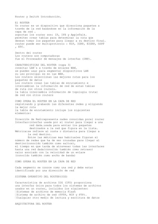 Un router es un dispositivo que dirige paquetes a través de una red basándose en la información de la capa de red. Los routers crean tablas de enrutamiento e intercambian información de topología con otros routers para determinar la mejor ruta para los paquetes. Los switches son dispositivos que conectan segmentos de red y transmiten datos dentro de una red local, pero no entre redes.