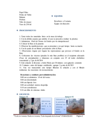 Este documento describe un experimento en el que se administra cloruro de zinc a una rata por vía intraperitoneal para analizar los efectos de la intoxicación por zinc. Se observa que la rata muere en 16 minutos mostrando síntomas como desorientación, hipoxia leve y convulsiones. Luego se realizan pruebas cualitativas en las vísceras para identificar la presencia de zinc, dando resultados positivos. El objetivo de reconocer zinc como toxico letal en un organismo vivo se cumple.