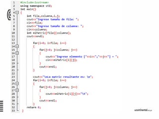 El documento aborda las estructuras de datos, centrándose en las matrices en C++, incluyendo su definición, declaración e inicialización. Describe cómo acceder y recorrer elementos en una matriz mediante ciclos for, así como varios ejercicios prácticos para aplicar estos conceptos. Además, se menciona la importancia de utilizar estas estructuras en la programación estructurada.