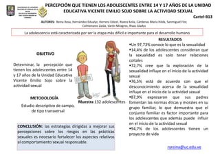 La mayoría de los adolescentes entre 14 y 17 años conocen la sexualidad y creen que la exploración y el desconocimiento sobre la sexualidad influyen en el inicio de la actividad sexual. Sus padres fomentan normas éticas y morales en el hogar, lo que demuestra que la familia es importante para los adolescentes y puede influir en el inicio de la actividad sexual. Se necesitan estrategias para mejorar las percepciones sobre los riesgos de las prácticas sexuales y fortalecer los aspectos del comportamiento sexual responsable.
