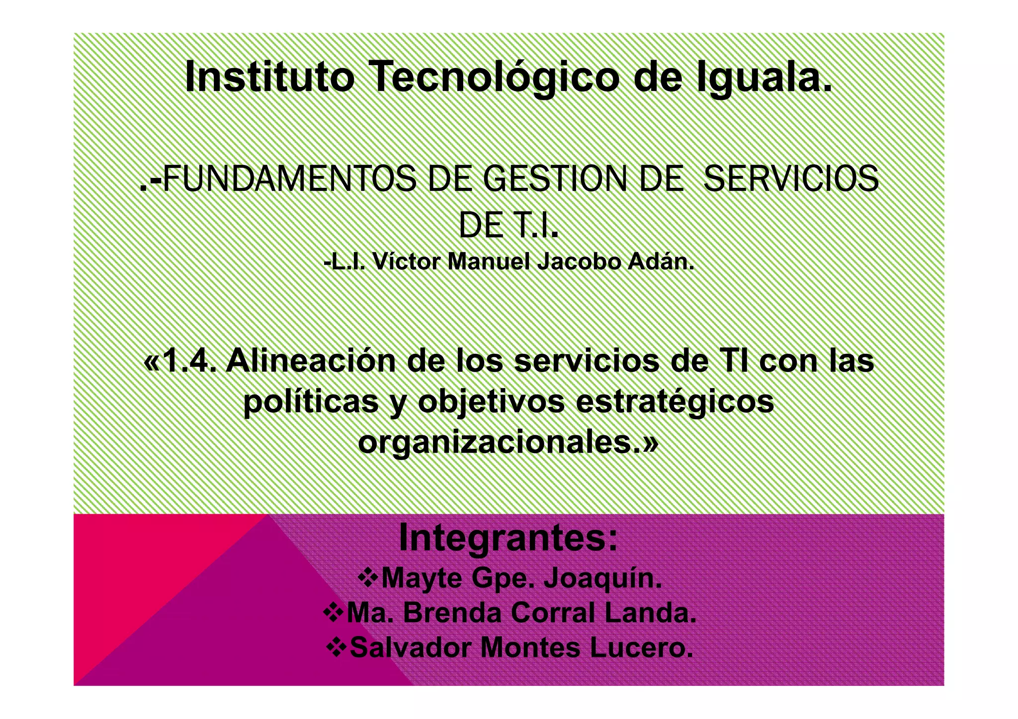Los servicios de TI deben alinearse con las políticas y objetivos estratégicos de la organización. Los objetivos deben ser claros, precisos y cuantificables, y permitir alcanzar metas específicas. Las estrategias son las herramientas que permiten lograr los objetivos teniendo en cuenta factores internos y externos. Los objetivos y estrategias deben estar perfectamente alineados para que la organización pueda enfrentar situaciones adversas y aprovechar oportunidades de manera efectiva.