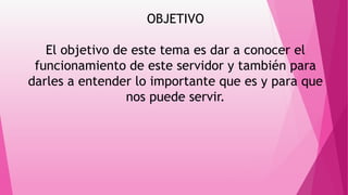 Este documento describe el servidor MySQL. MySQL es un sistema de gestión de bases de datos relacional, multihilo y multiusuario que tiene más de seis millones de instalaciones. Se utiliza comúnmente en aplicaciones web como Drupal o phpBB y permite el acceso a las bases de datos desde varios lenguajes de programación. MySQL es rápido para lecturas y es ideal para aplicaciones web, aunque puede tener problemas de integridad en entornos de alta concurrencia.