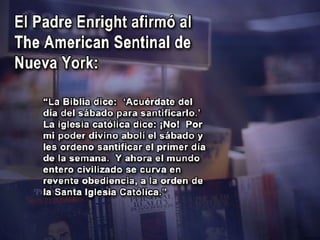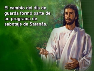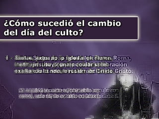 El documento discute cómo el día de culto cambió del sábado al domingo. Menciona que la Biblia advierte que este cambio sucedería. Luego, describe que en el 321 d.C. el Concilio de Laodicea decretó transferir la solemnidad del sábado al domingo. Finalmente, reconoce que fue la Iglesia la que tomó el día pagano del domingo y lo convirtió en el día cristiano de culto, en contra de la voluntad de los apóstoles.
