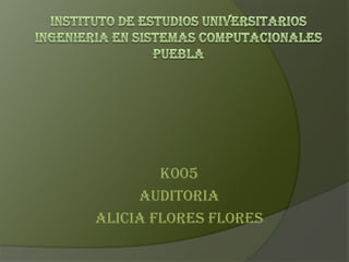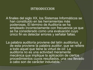 El documento habla sobre la auditoría de sistemas informáticos. Explica que la auditoría no es solo para detectar errores, sino también para evaluar y controlar los sistemas de manera integral. Describe los objetivos de la auditoría informática como evaluar aspectos como la seguridad, confidencialidad y costos del sistema. También cubre principios y reglas de auditoría e identifica medios técnicos, humanos y financieros disponibles para realizar auditorías efectivas.
