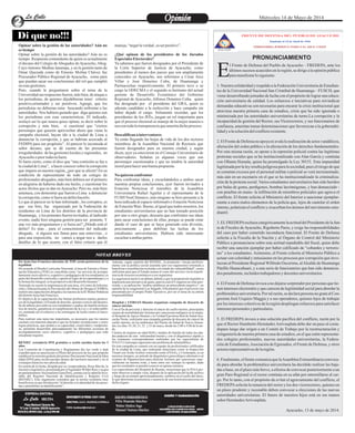 El documento informa sobre varios temas relacionados con la situación actual en la Universidad Nacional San Cristóbal de Huamanga (UNSCH) en Ayacucho, Perú. Los estudiantes y egresados se han movilizado en protesta contra la intervención de una comisión designada por el gobierno. También se menciona la solidaridad del Frente de Defensa del Pueblo de Ayacucho con los estudiantes y su oposición a la represión policial de protestas. El Frente pide la renuncia del rector y vicerrectores de la universidad