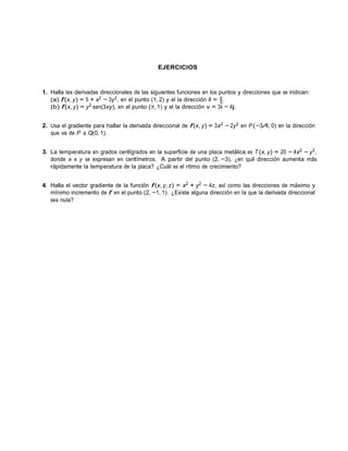 El documento explica la derivada direccional y el gradiente de funciones de dos y tres variables. La derivada direccional mide el cambio en una función en una dirección específica, y puede expresarse en términos del gradiente, que es el vector de las derivadas parciales. El gradiente indica las direcciones de mayor y menor cambio en la función.