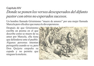Un pastor llamado Grisóstomo murió de amor por una mujer llamada Marcela. Antes de morir, Grisóstomo escribió un poema describiendo su amor no correspondido por Marcela. Después de su muerte, Marcela tuvo que defenderse ante el pueblo, que la culpaba por la muerte de Grisóstomo. Cuando Marcela intentó irse, Don Quijote empuñó su espada para protegerla y evitar que la molestaran.