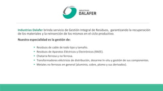Industrias Dalafer ofrece soluciones integrales para la gestión de residuos, incluyendo cables, aparatos eléctricos y electrónicos, chatarra ferrosa y no ferrosa, y transformadores eléctricos. El documento describe los procesos de reciclaje de transformadores y cables para recuperar cobre, incluyendo la extracción de aceite, desarme de componentes, trituración, y segregación para obtener cobre molido como producto final.
