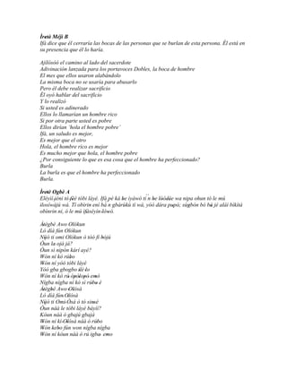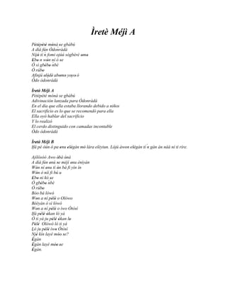 Este documento presenta tres historias relacionadas con Olókun, Olósà y Atan después de recibir consejos de Ifá. Se les dice a los tres que realicen sacrificios para lograr el éxito y la prosperidad. Olókun y Olósà completan con éxito sus sacrificios, mientras que la esposa de Atan interfiere con su ofrenda, impidiéndole completar el ritual.