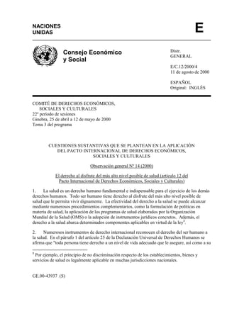 Este documento presenta la Observación General No 14 del Comité de Derechos Económicos, Sociales y Culturales sobre el derecho a la salud establecido en el Artículo 12 del Pacto Internacional de Derechos Económicos, Sociales y Culturales. Explica que el derecho a la salud incluye tanto libertades como el derecho a controlar la propia salud, como derechos como tener acceso a servicios de salud. También describe las obligaciones de los estados parte en garantizar el más alto nivel posible de salud para sus ciudadan