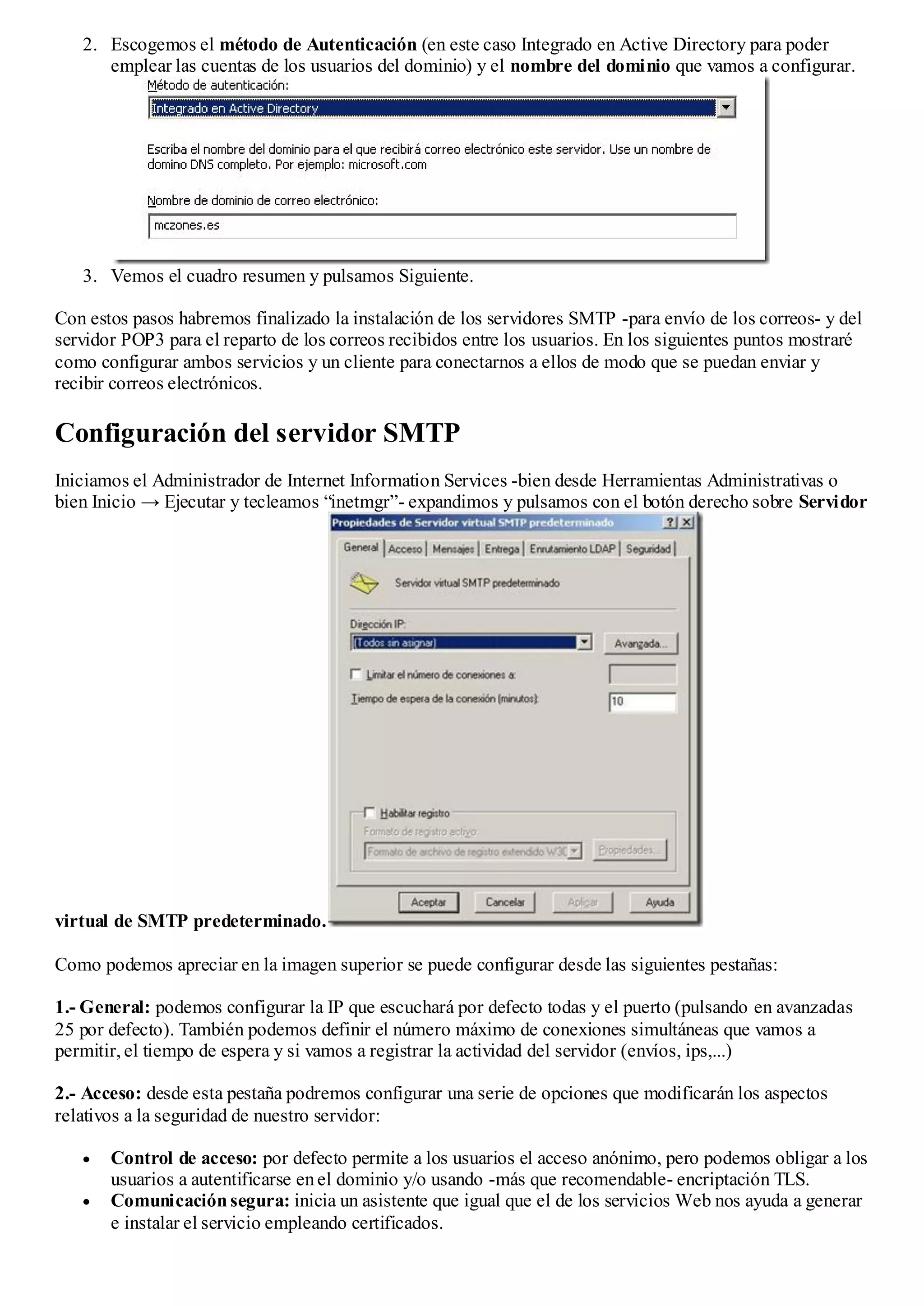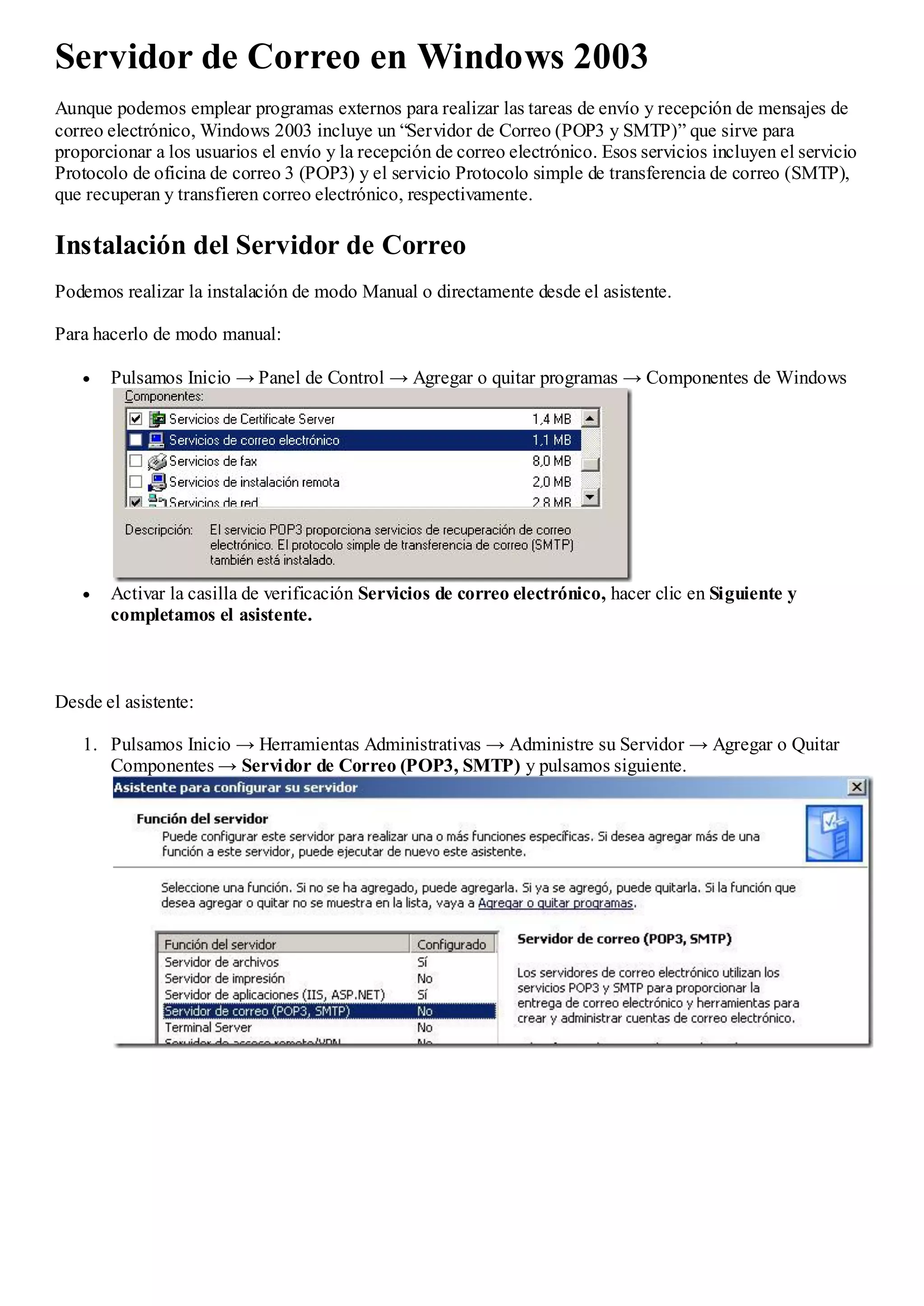 El documento describe la instalación y configuración del servidor de correo en Windows 2003. Incluye los servicios POP3 y SMTP para permitir el envío y recepción de correo electrónico. Explica cómo instalar los servicios de forma manual o automática, configurar el servidor SMTP y POP3, crear buzones de correo para los usuarios, y configurar un cliente como Outlook Express para enviar y recibir correo.