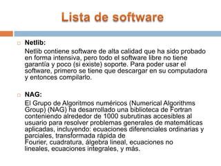 El documento describe varios softwares disponibles para realizar cálculos numéricos, incluyendo Netlib, NAG, IMSL, NumericalRecipes, MATLAB y GNU Octave. Netlib y NAG contienen bibliotecas de rutinas probadas para resolver problemas matemáticos comunes. IMSL y NumericalRecipes también cubren áreas similares, aunque IMSL es de mayor alcance y calidad. MATLAB y GNU Octave son programas de cálculo numérico orientados a matrices y vectores que permiten ejecutar comandos de forma interactiva.