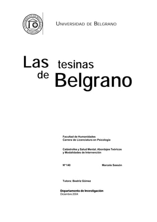 Este documento resume un trabajo de investigación sobre catástrofes y salud mental. Comienza con una breve historia del estudio del trauma psicológico y define los términos catástrofe y desastre. Luego describe el impacto de este tipo de eventos, incluidos los tipos de respuestas individuales y colectivas. Finalmente, analiza diferentes intervenciones en situaciones de catástrofe y desastre, como la prevención y el tratamiento del trastorno de estrés postraumático.