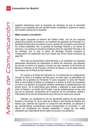 El presidente de la Comunidad de Madrid, Ignacio González, inauguró las obras de remodelación de varias calles y plazas en Aranjuez con una inversión de 2,8 millones de euros, mejorando el acceso y seguridad vial en la localidad. El proyecto tiene como objetivo recuperar el entorno del Palacio Real, patrimonio cultural de la UNESCO, incluyendo la peatonalización de la calle Reina y la modificación de las glorietas para optimizar el tráfico. Esta actuación es parte del plan regional de inversiones (PRISMA) que ha permitido realizar 4.500 proyectos en la región en los últimos diez años.