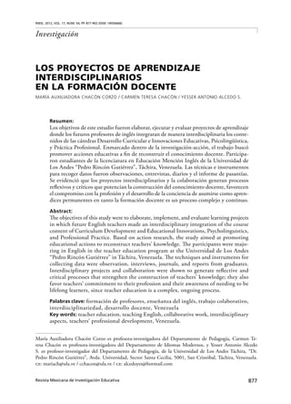 Este documento describe un estudio realizado en una universidad venezolana que tuvo como objetivo desarrollar, implementar y evaluar proyectos de aprendizaje interdisciplinarios para estudiantes de educación mención inglés. Los proyectos integraron los contenidos de tres asignaturas: Desarrollo Curricular e Innovaciones Educativas, Psicolingüística y Práctica Profesional. El estudio buscó promover acciones educativas para reconstruir el conocimiento docente de los estudiantes a través de la investigación-acción.