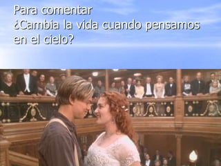 El documento describe lo que es el cielo según la fe cristiana. El cielo es la unión perfecta con Dios y los santos en la vida eterna, donde se verá a Dios cara a cara y se poseerá su amor. Tanto el Antiguo como el Nuevo Testamento enfatizan la existencia del cielo como meta final y motivación para vivir moralmente. La vida eterna en el cielo superará cualquier alegría terrenal e implicará la visión intuitiva de Dios, amor íntimo con Él, deificación del alma y