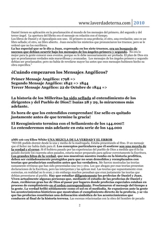 Este documento discute la profecía bíblica de los 2520 días y 144.000 sellos mencionados en el Apocalipsis. Explica que la profecía de los 2520 días, aunque olvidada, es la profecía más larga de la Biblia. También analiza los mensajes angélicos del Apocalipsis y cuando comenzaron a proclamarse, así como el sello que fue quitado de la profecía antes del cierre de la gracia. Finalmente, advierte sobre las teorías que mezclan la verdad y el error y debilitan los fundamentos de