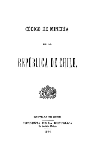 Este documento presenta el Código de Minería de Chile de 1874. Establece las reglas para la propiedad y explotación de minas en Chile, incluyendo quién puede ser propietario de una mina, cómo se pueden descubrir y registrar nuevas minas, y las servidumbres asociadas con la explotación minera.