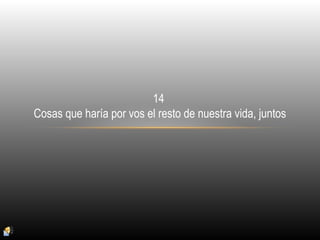 El documento enumera 14 cosas que el autor haría por su pareja para demostrar su compromiso y amor. Estas incluyen abrazarla siempre, recordarle lo hermosa que es, decirle que la ama diariamente, llamarla varias veces al día, tomar café juntos, compartir momentos íntimos, darle besos de buenas noches, ser solo de ella, acompañarla en viajes, cuidarla y protegerla, contarle todo, dejarla manejar el control remoto, operarse para dejar de roncar, y hacerla su esposa.