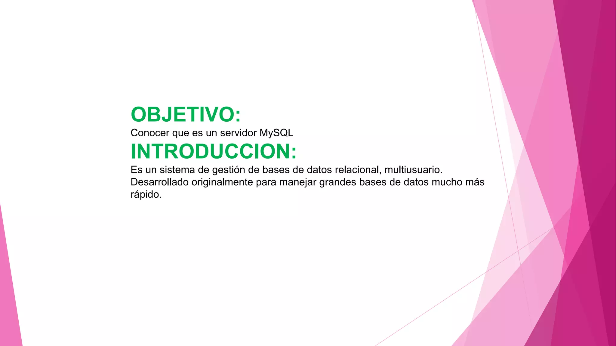 MySQL es un sistema de gestión de bases de datos relacional, multiusuario y multihilo que se utiliza para almacenar y administrar grandes cantidades de datos de manera rápida y eficiente. Permite crear, modificar y acceder a bases de datos desde diversos lenguajes de programación. Es el servidor de bases de datos más popular debido a su velocidad, conectividad y seguridad para usar bases de datos en Internet.