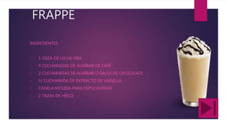 El documento presenta las recetas y los ingredientes para 10 bebidas y comidas dulces como frappes de café, café americano, té verde, capuchino, sidra de manzana, atole de guayaba, licuado de fresa, ponche, licuado de plátano y chocolate caliente con canela. Se enumeran detalladamente los ingredientes necesarios para preparar cada receta.